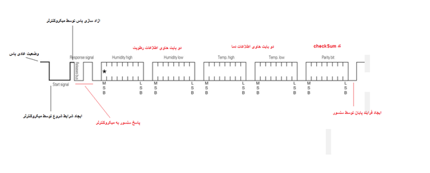 در تصویر بالا فرایند ارسال اطلاعات سنسور مشخص شده است.سنسور ابتدا بایت پرارزش (از دو بایت دیتای دما یا رطوبت) و بیت پر ارزش (در هر بایت) را برای ما ارسال می کند.