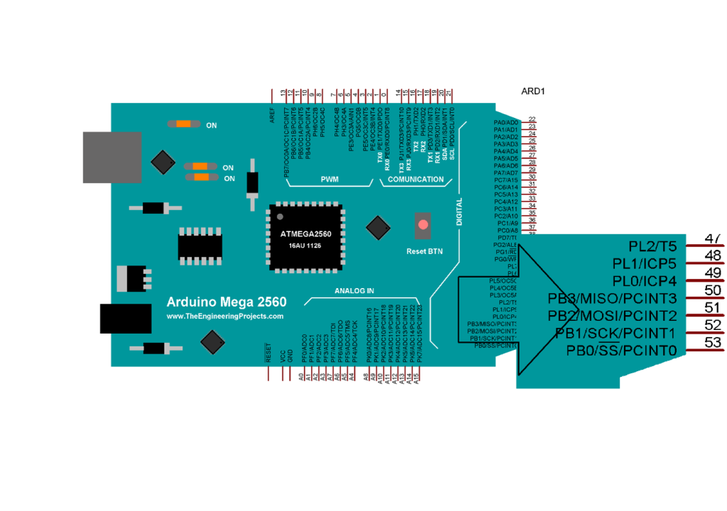 این ماژول در سمت چپ خود دارای 5 پایه می باشد که پایه VCC ان باید به ولتاژ 5 ولت متصل گردد و پایه GND ان با پایه زمین اردوینو یکی شود همچنین پایه DIN ان باید به پایه MOSI میکروکنترلر متصل شود و پایه CLK ان به پایه کلاک SPI میکروکنترلر وصل شود .شما می توانید از هر ماژول اردوینو دیگری استفاده نمایید و پایه CS که پایه chip select ای سی می باشد را به هر پایه ی دلخواه متصل نمایید.ما از ماژول mega 2560 استفاده کرده ایم در زیر پایه های ان را مشاهده می کنید:
