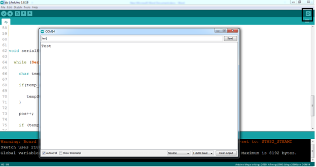 بعد از باز کردن ترمینال سریال اردوینو کافی است در کادر مشخص شده متن خود را تایپ کرده و اینتر را بزنید تا متن به اردوینو ارسال شود.