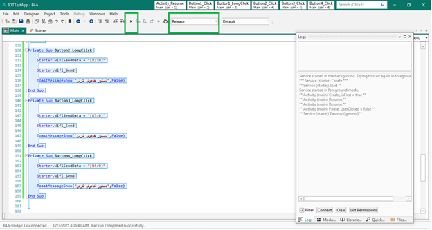 برای خاموش کردن رله ها می توانیم 4 باتن دیگر اضافه کنیم ولی برای جلوگیری از شلوغ شدن برنامه تابع longClick هر باتن را نیز اضافه می کنیم تا بتوانیم رله ها را خاموش کنیم. اگر به مدت طولانی باتن ها را نگه دارید تابع longClick اجرا می شود.برنامه در صورت روشن بودن وای فای برد خودکار به برد متصل می شود.در صورت نیاز می توانید باتن های جداگانه ای برای اتصال و disconnect به برنامه اضافه نمایید.
