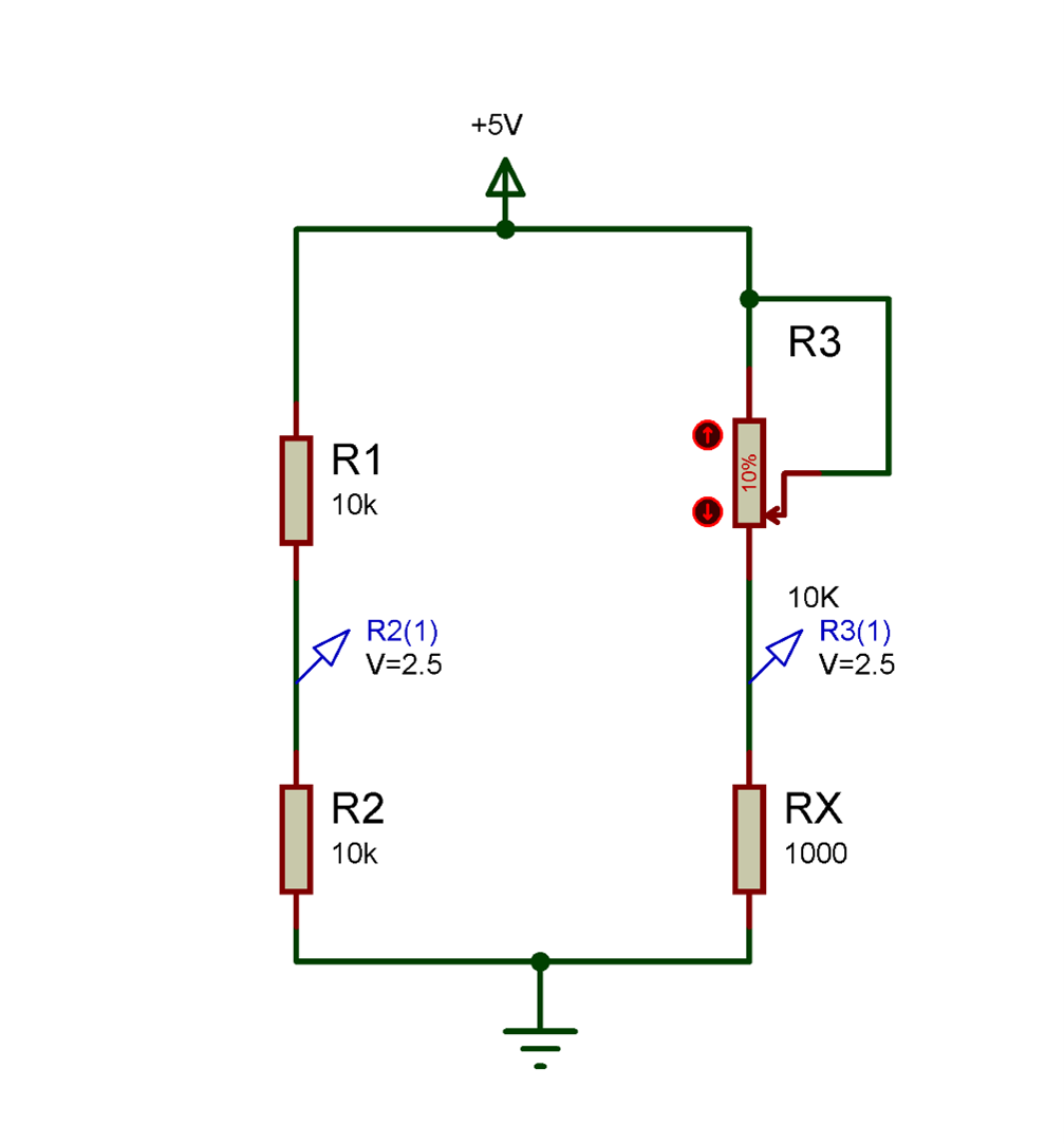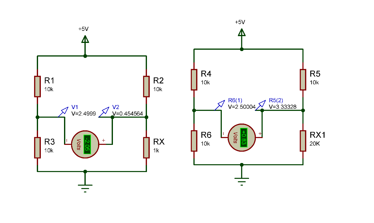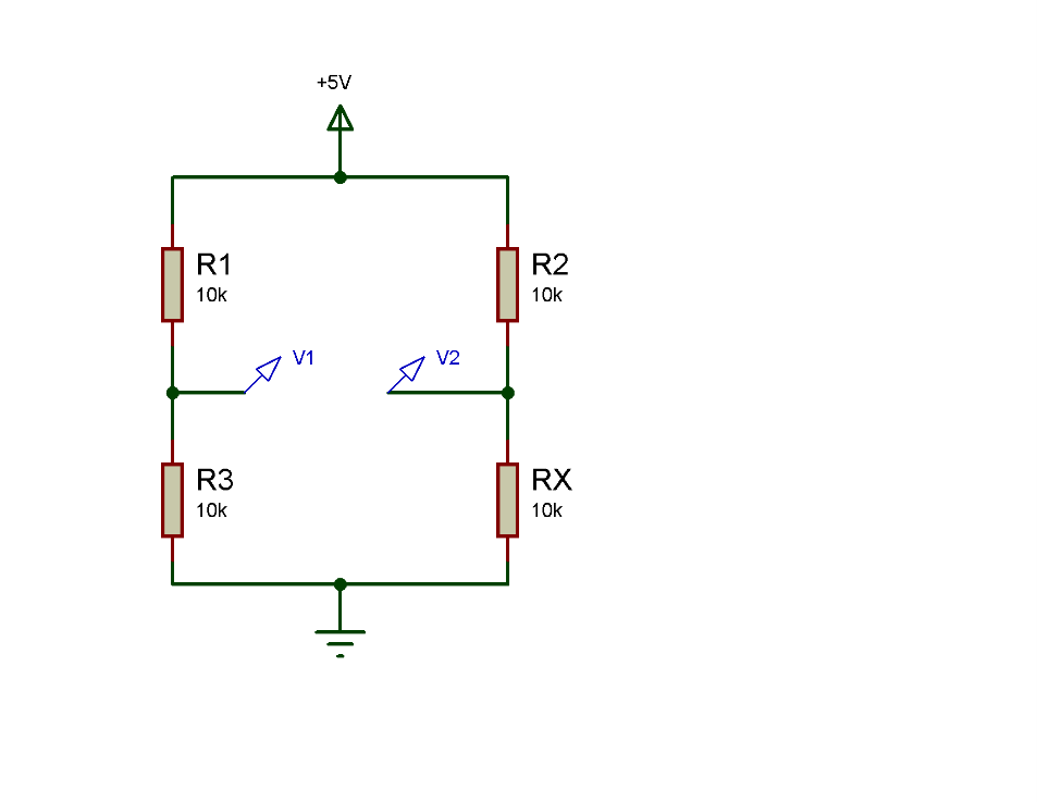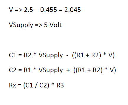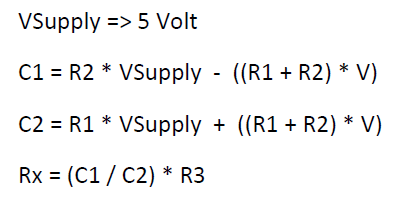 در مدار فوق مقدار مقاومت RX را نمی دانیم ولی با اندازه گیری اختلاف ولتاژ V1 , V2 توسط ولتمتر یا ADC میکروکنترلر و استفاده از فرمول (بخاطر تلرانس مقاومتها و برای افزایش دقت باید مقاومتهای معلوم با تلرانس کم در نظر گرفته شوند) مقدار ان بدست می اید.