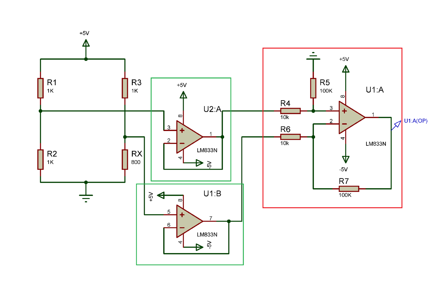 کادر سبز : از اپ امپ در حالت بافر ولتاژ استفاده شده است.هر چقدر امپدانس ورودی اپ امپ بافر ما یا هر مدار بافر دیگری بیشتر باشد تاثیر بر مقاومتهای پل کمتر خواهد شد.