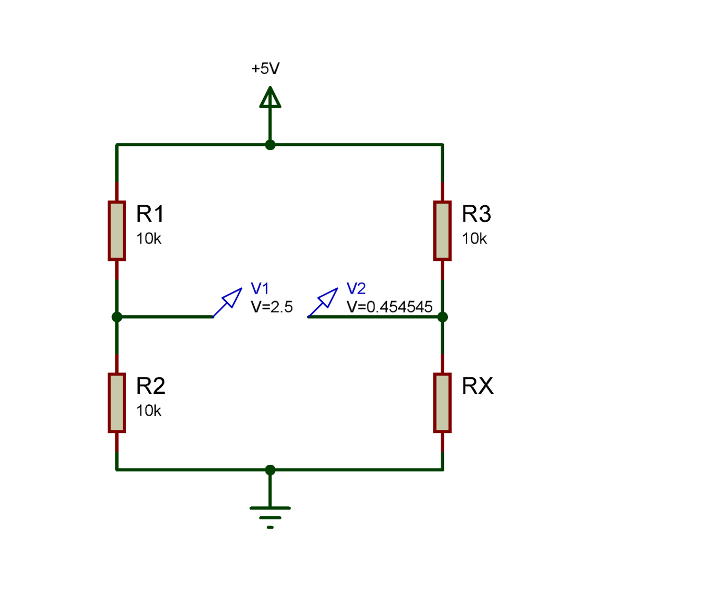 اگر مقاومت RX را مقاومت مجهول در نظر بگیریم و در صورتی که مقادیر تمام مقاومت ها با هم برابر باشند ولتاژ V1 و V2 با هم برابر خواهد بود (در اینجا 2.5 ولت) و اختلاف ولتاژ V1 و V2 صفر خواهد شد و اصطلاحا پل در حالت تعادل قرار خواهد گرفت.